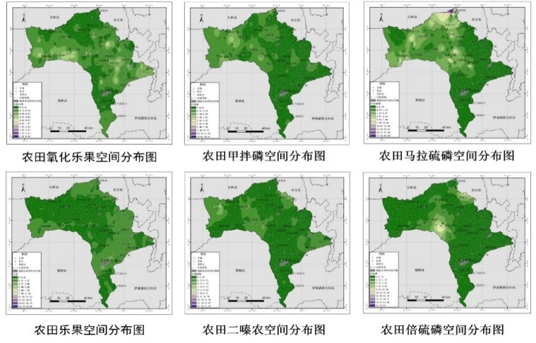 以吉林省薄层黑土区—公主岭地区为代表,以乡镇为中心,结合田块分布,按主导风向布设采样点,按照《农田土壤环境质量监测技术规范》(NY/T 395-2000)、《土壤环境监测技术规范》(HJ/T166-2004)分析了研究区16种有机磷农药的残留特征。研究表明,区域土壤氧化乐果残留量范围为0~0.86 µg/kg,高值区集中于公主岭市桑树台镇、十屋镇和响水镇等地区;甲拌磷残留量范围为0~2.17 µg/kg,高值区集中于公主岭市毛城子镇、桑树台镇、八屋镇等地区;乐果残留量范围为0~2.40 µg/kg,乐果高值区集中于公主岭市桑树台镇、十屋镇、双城堡镇等地区;二嗪农残留量范围为0~4.57 µg/kg,高值区集中于公主岭市玻璃城子镇西部等地;马拉硫磷残留量范围为0~56.72 µg/kg,马拉硫磷高值区集中于公主岭市双城堡镇、毛城子镇、桑树台镇、莲花山乡东北部、大榆树镇及黑林子镇附近地区。农田土壤倍硫磷残留量范围为0~16.43 µg/kg,高值区集中于公主岭市秦家屯镇及育林乡附近地区。总的来说,有机磷农药总量高值区主要集中于公主岭市秦家屯镇、大岭镇、双城堡镇附近地区。
